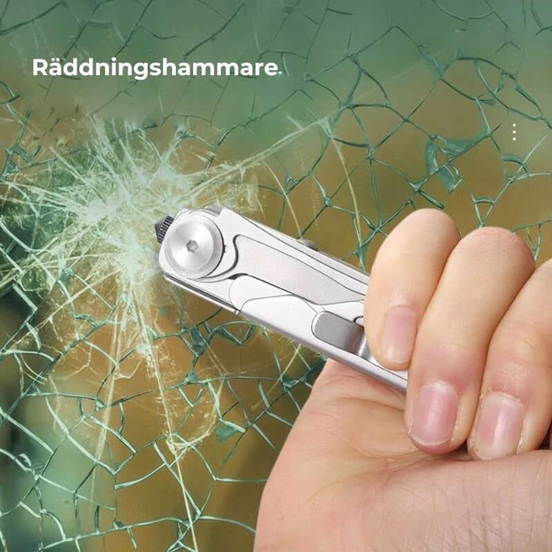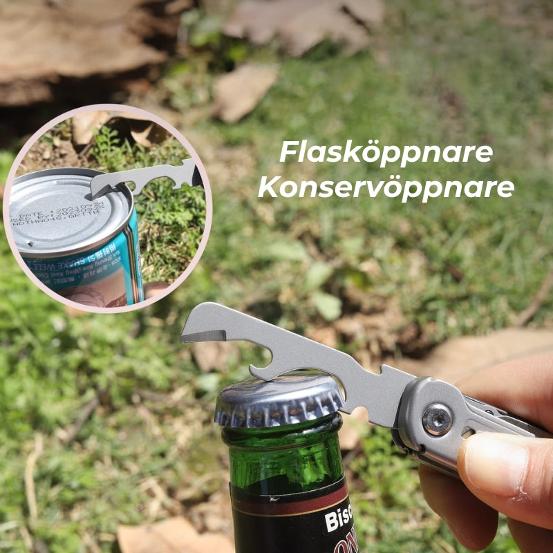 ALLT-I-ETT MULTIVERKTYG: tandat knivblad, burköppnare, flasköppnare, såg, glasbrytare, knivblad, trådavskalare, sax.