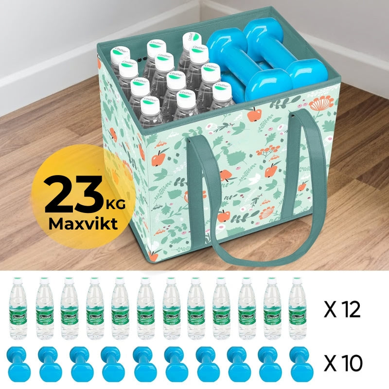 - Rymlig låda (25 × 28 × 33 cm) med stadig botten och 30 cm långa handtag – perfekt för fulla matkassar eller tung tvätt.