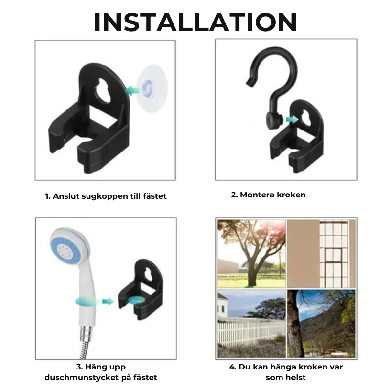 - đżDuschhuvudet sitter stadigt fast pĂ„ alla plana ytor med den medföljande sugkoppen med en krok sĂ„ att du kan hĂ€nga duschhuvudet ovanför huvudet.