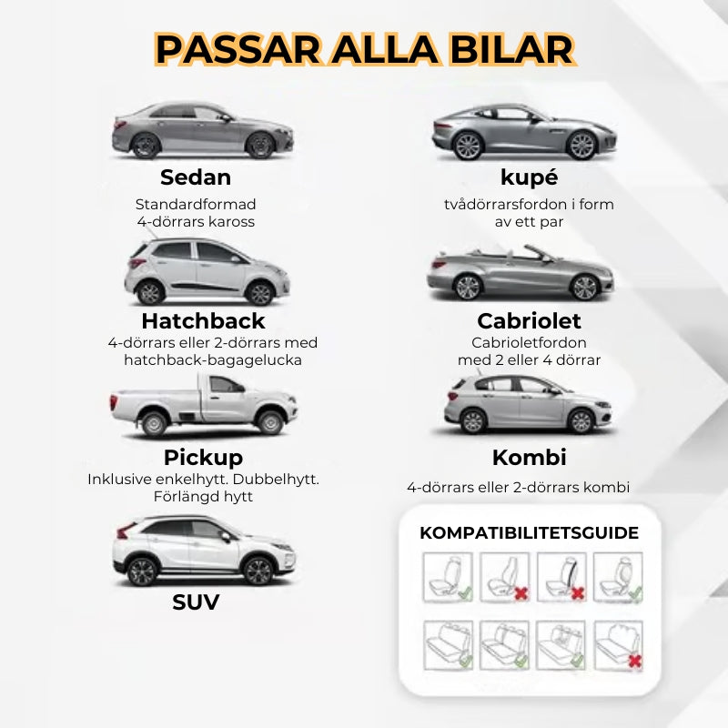 Denna bilklädsel passar på nästan alla standardbil- och lastbilar. Tack vare det flexibla materialet och de justerbara fästremmarna sitter den perfekt, så att din stol förblir helt skyddad utan att glida.