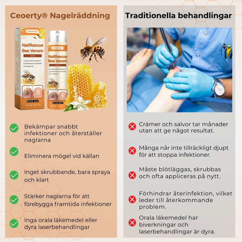 Till skillnad från traditionella behandlingar erbjuder Crucial® NailRescue Bee Venom Spray en ren och smidig lösning mot nagelsvamp. Den naturliga formulan är skonsam mot huden men kraftfull mot svamp – helt utan aggressiva kemikalier eller oönskade biverkningar.