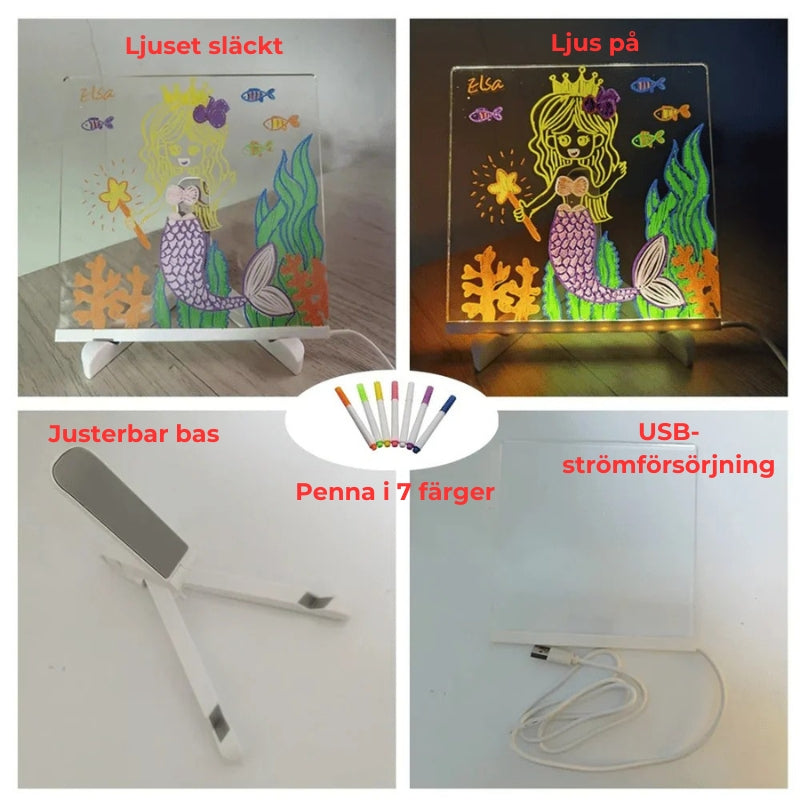Lätt att använda! Skriv eller rita dina meddelanden och mönster. Anslut tavlan via USB för en lysande effekt, eller använd den utan belysning. Ställ den enkelt på det medföljande stativet, och torka av den med en trasa när du är klar – för oändliga kreativa möjligheter!