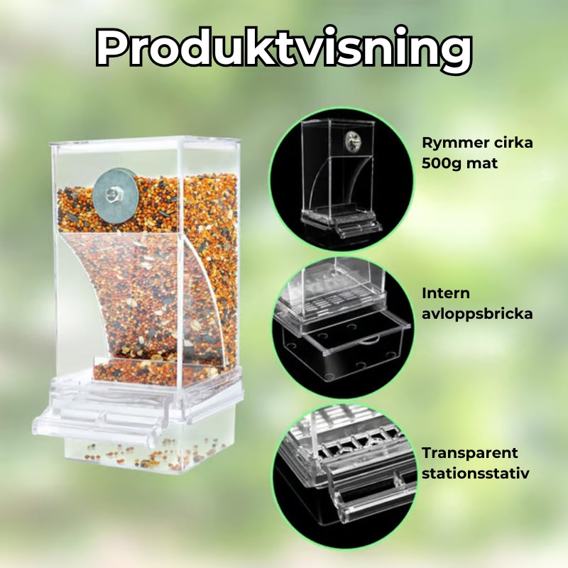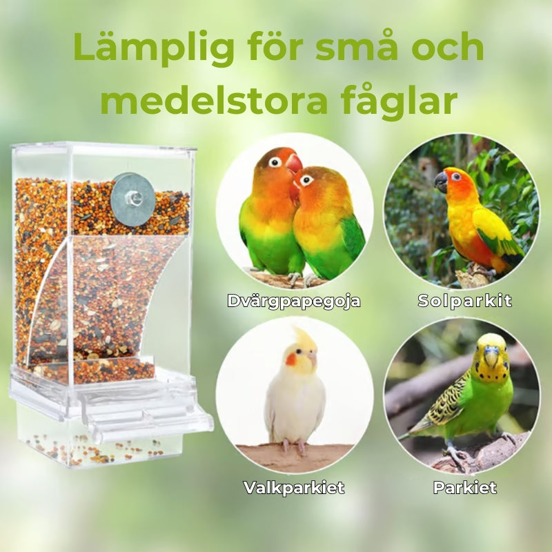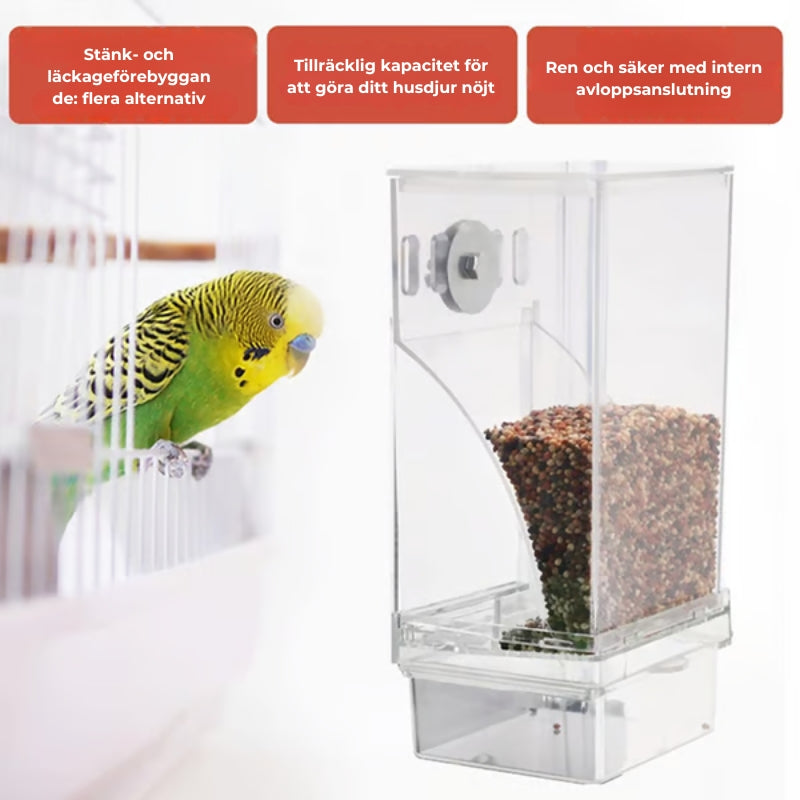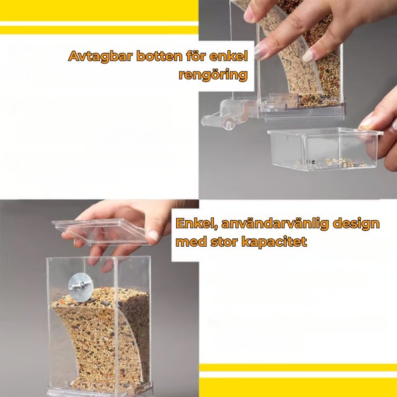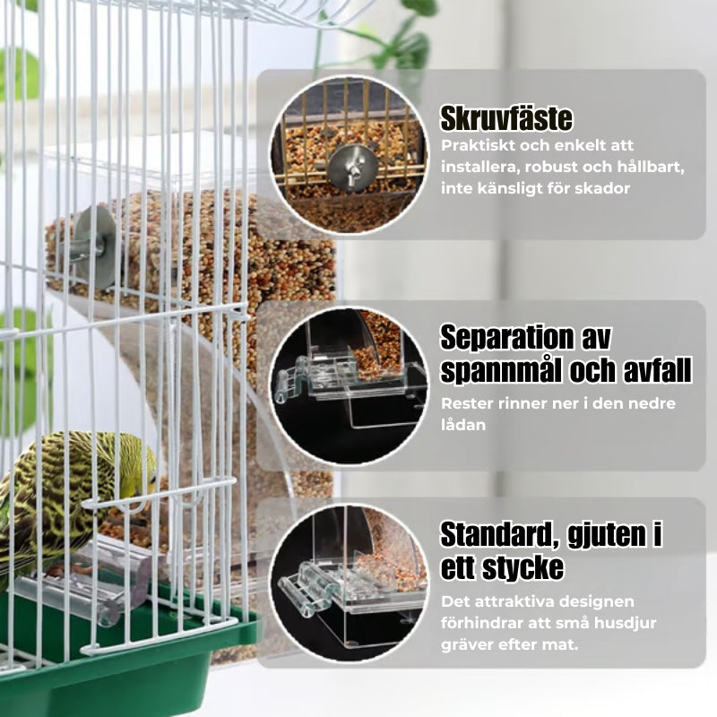 ăFĂ„gelmatare utan spillăDin fĂ„gel kan enkelt komma Ă„t maten och skal och oĂ€tna frön stannar kvar i facket under. PĂ„ sĂ„ sĂ€tt hĂ„lls fĂ„gelburen ren och spill minimeras. Automatisk matning genom logisk tyngdkraft, vilket sparar tid och energi.