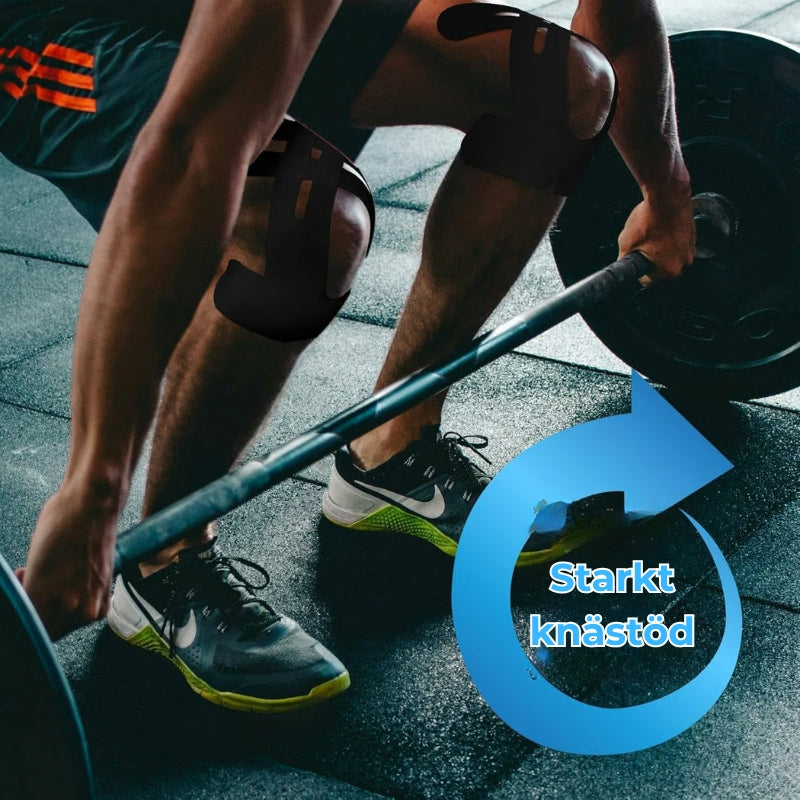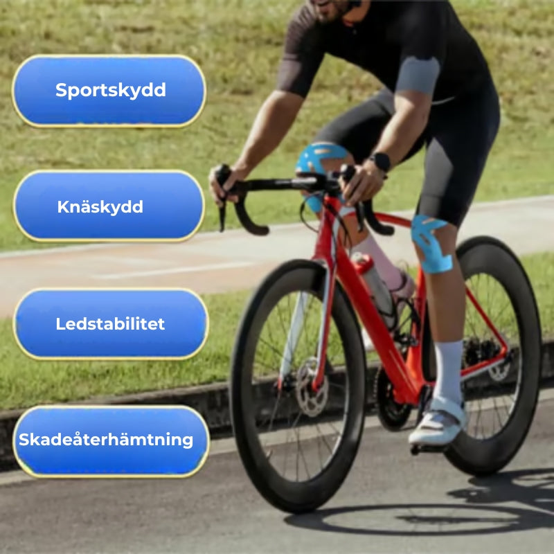 Stark stöd och stabilitet: Ger starkt stöd och stabilitet i tejpad position för att skydda knämuskulaturen i viss utsträckning. Tejpen förebygger effektivt idrottsskador som knästräckningar under träning.