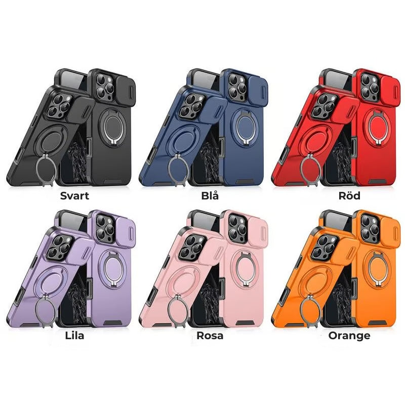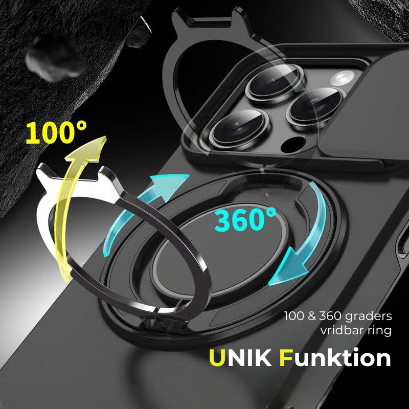 iPhone-fodral med skjutbart kameraskydd och vridbart ringstativ