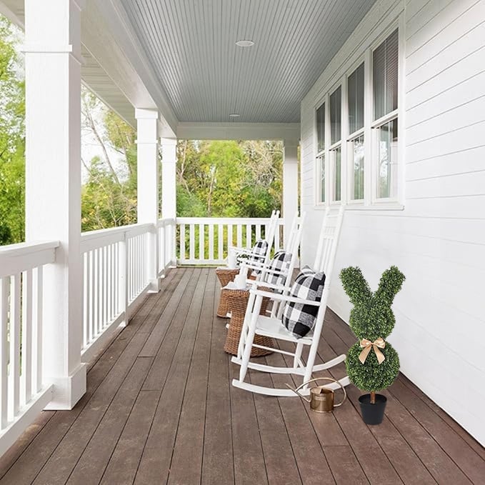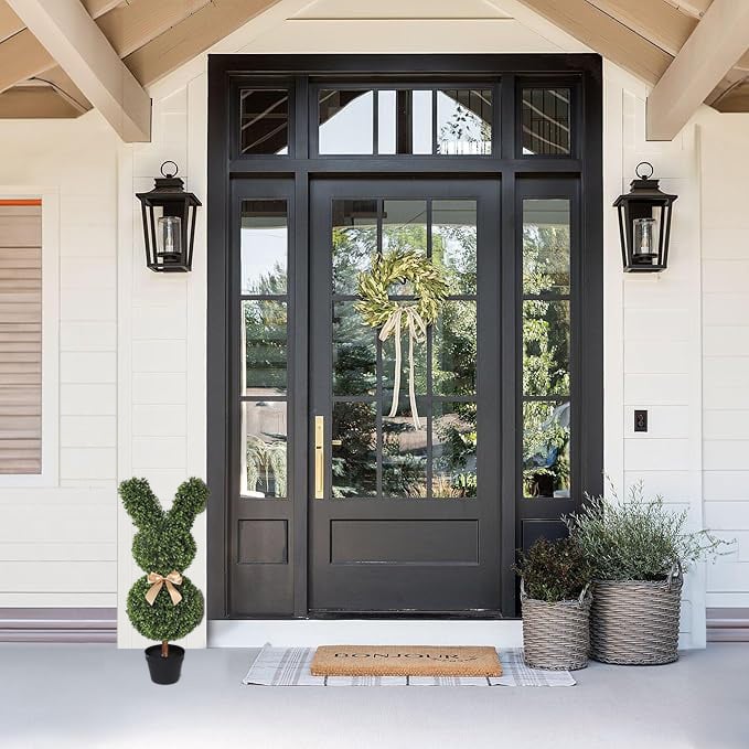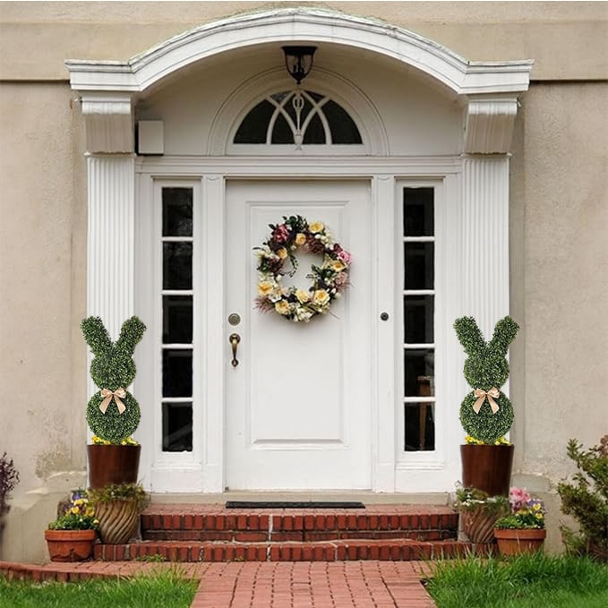 Denna charmiga topiary-växt är formad som en kanin och består av två gröna klot, där den övre delen bildar kaninens öron. Mellan kloten sitter en söt brun rosett som ger extra karaktär. En lekfull dekoration som passar både inne och ute!