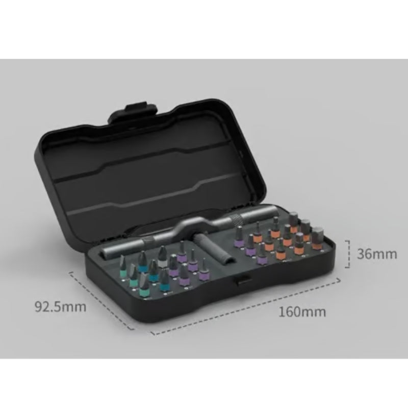 Denna 24-i-1 skruvmejsel är det perfekta verktyget för alla som söker precision och mångsidighet. Med 24 utbytbara skruvbits och ett smart plug-and-play-system kan du skruva i alla riktningar utan ansträngning, även på svåråtkomliga ställen. Tillverkad av högkvalitativt aluminium, vilket gör den både lätt och extremt hållbar.