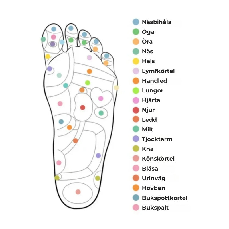 Dessa punkter är inriktade på de viktigaste tryckpunkterna på fotens undersida, vilket lindrar trötthet och smärta och främjar avslappning och allmänt välbefinnande.
