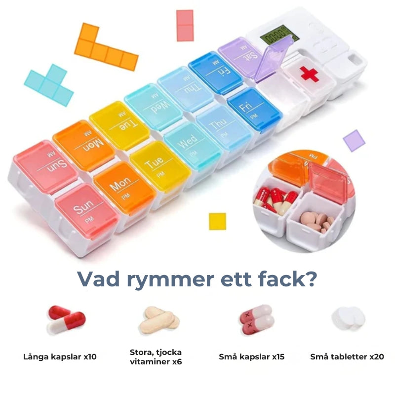 Glöm blandade tabletter eller otillräckliga fack. Förvara varje kapsel, vitamin och tablett perfekt åtskilda och med det utrymme du behöver för att organisera din vecka utan stress och förvirring.